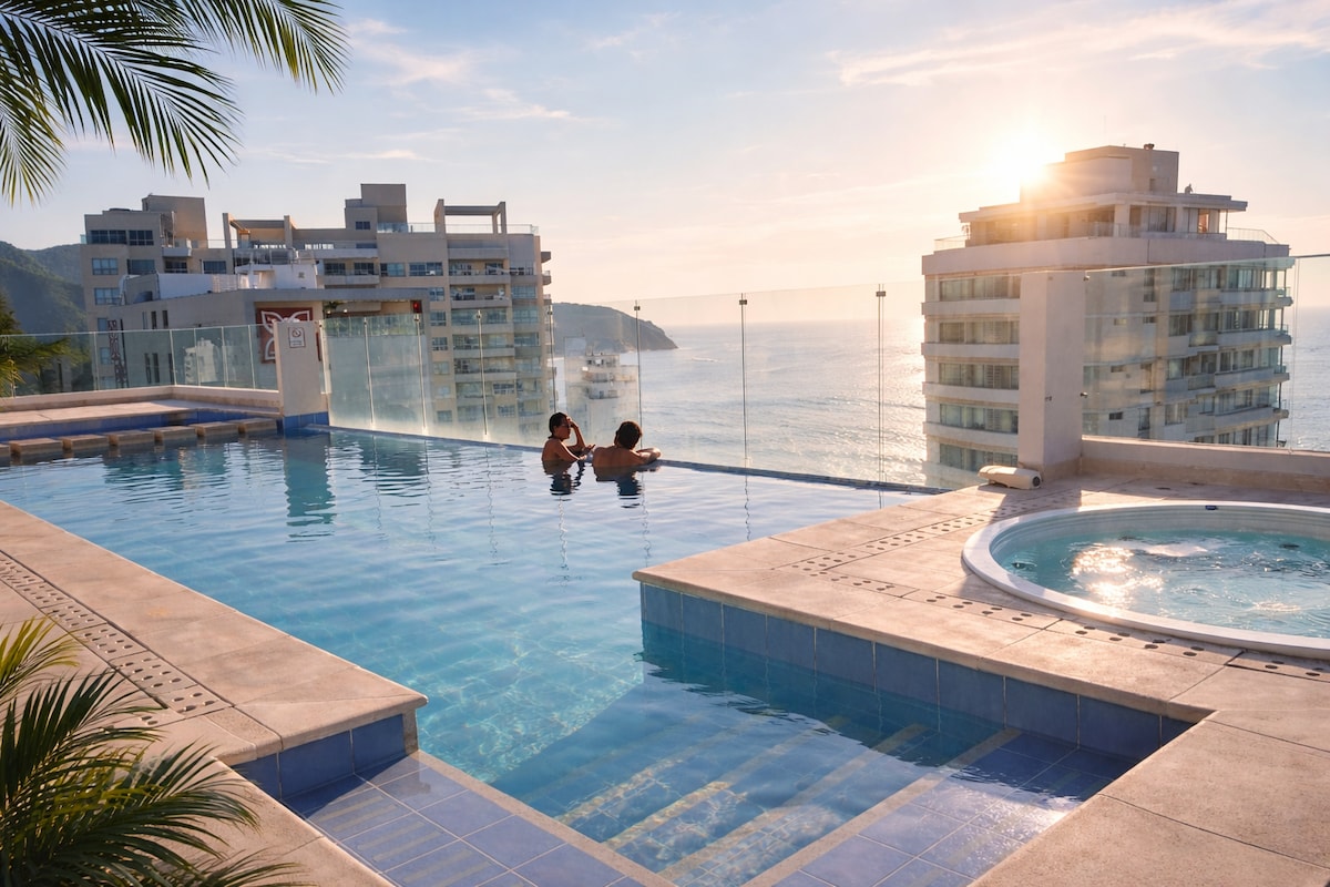 Pumunta sa rooftop kung saan makakapagrelaks ka sa dalawang swimming pool! Ang apartment ay maigsing distansya (sa paligid ng 5 minuto) sa bay area, sa beach at sa pinakamahusay na gastronomy at kultura na inaalok ng lungsod. Huwag mahiyang maging komportable kami para sa mga rekomendasyon! Ang gitnang lokasyon ng apartment ay perpekto para sa pagbisita sa mga lokal na beach pati na rin ang mga pinakasikat na kalapit na atraksyon: Tayrona Park, Palomino, Minca, at Lost City (upang pangalanan ang ilan!).