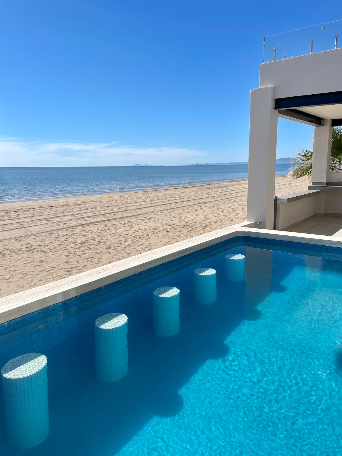Email:info@beachhomesbyclaudia.com Dalhin ang buong pamilya sa isang magandang lugar. Nag - aalok ang magandang bahay bakasyunan na ito ng karangyaan at kaginhawaan, habang tinatanggap pa rin ang nakalatag na pamumuhay ng Kino Bay. Masiyahan sa mga amenidad ng maaliwalas na beach house na ito habang nakatingin sa mga tanawin ng tubig ng Sea Of Cortez. Ang bukas na plano sa sahig ay nagbibigay - daan para sa mahusay na kasiyahan at libangan ng pamilya. Ang pinakamagandang katangian ng bahay ay ang magandang heated pool. Nakaupo ito sa mismong buhangin at walang harang na tanawin ng malalim na asul na tubig.