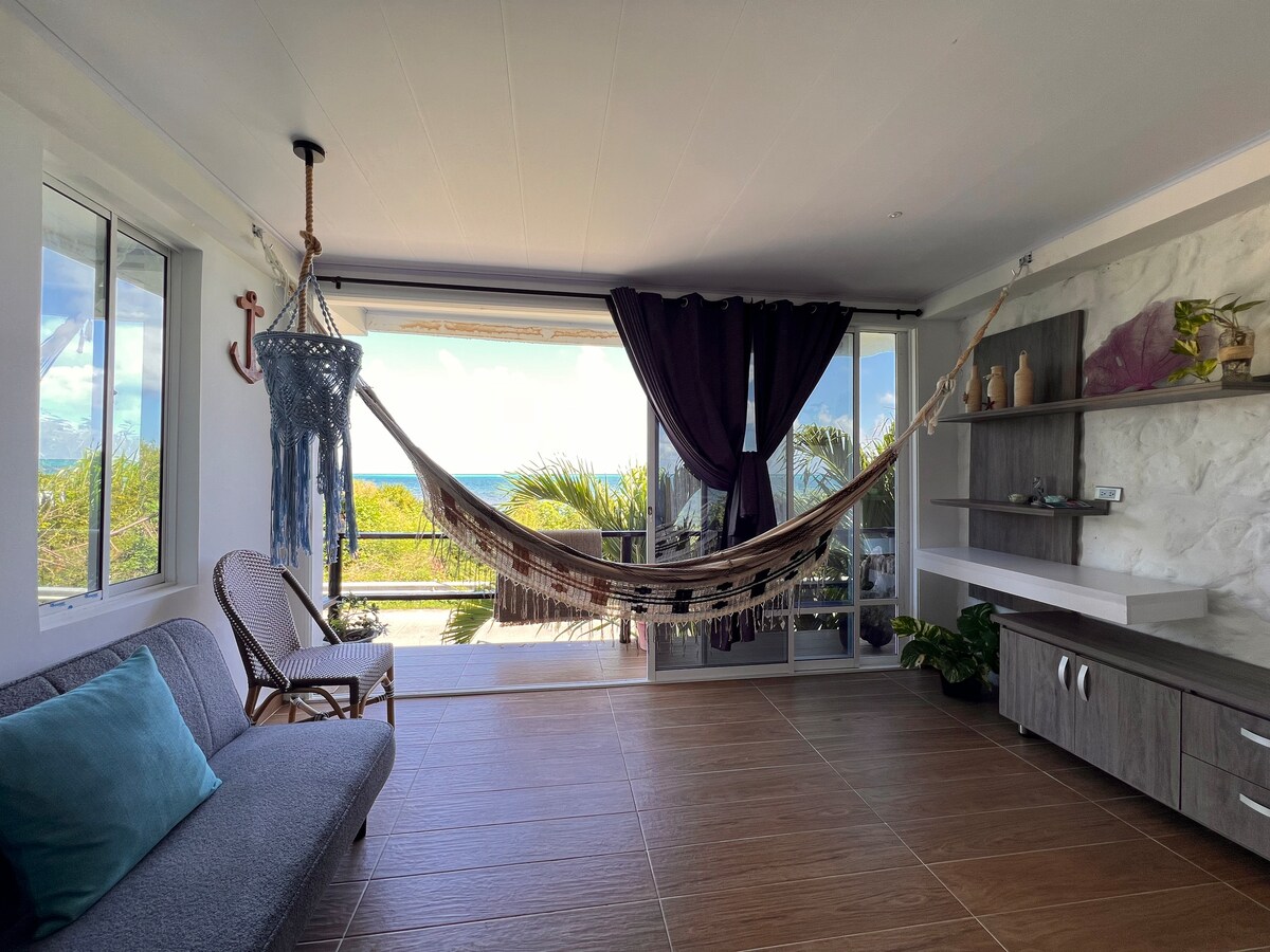 Wake up to the sound of the waves and enjoy breathtaking ocean views right from your private balcony. The apartment features a comfortable bedroom with a private bathroom, a fully equipped kitchen, and a chill open space perfect for enjoying the sea breeze. wood textures, and a laid-back atmosphere, this space invites you to slow down and feel the good island vibes. Come and experience authentic island living in a place made with love, surrounded by nature and the sea.