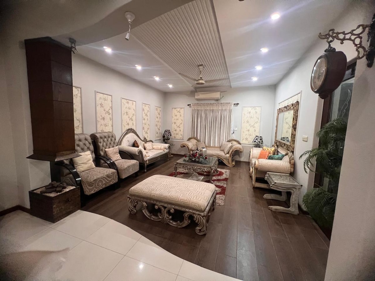 Damhin ang pinakamaganda sa Lahore sa aming 3 - silid - tulugan na tuluyan, na may perpektong lokasyon sa isa sa mga pinakaligtas at prestihiyosong lipunan sa lungsod, isang perpektong lugar para sa mga kaibigan, mga taong nagtatrabaho, mga pamilya na nagbabakasyon. Mayroon itong TV lounge, drawing room, sala at kainan, garahe at kusina. Ang bawat kuwarto ay may sariling terrace, banyo at ang bahay ay matatagpuan sa isang magandang kapitbahayan na may masikip na seguridad, mga pamilihan, mga superstores sa malapit. Kasama ang lahat ng kuwarto ng Ac sa presyong ito.