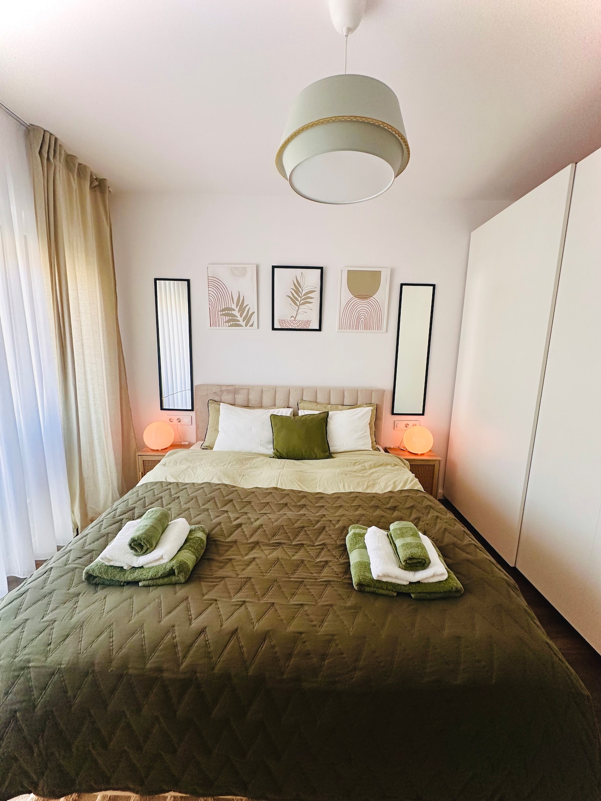 The apartment is situated in a new residential building, in the vicinity of Prima shops and Lotus retail park, where you can find many restaurants and shops. Inside the apartment everything is brand new, from modern custom furniture, to towels, bed linens, mattress, appliances and everything the kitchen is equipped with. You can enjoy a delicious coffee or a cup of tea. We have central underfloor heating and AC unit. Self check in after 2pm The capacity is for 3 people Free parking spot.
