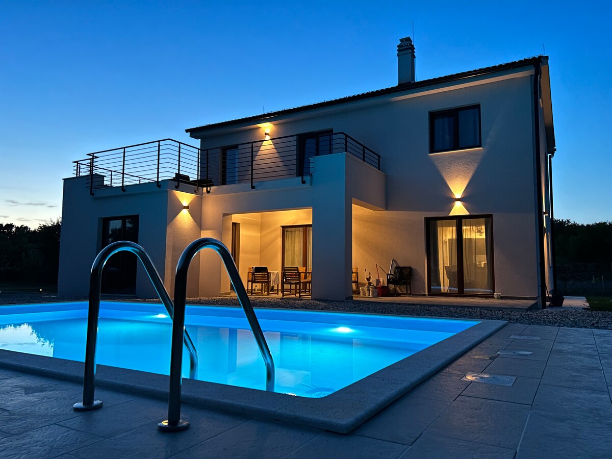 Matatagpuan ang katangi - tanging Villa Harmony sa isla ng Krk. Mayroon itong nakakamanghang malalawak na tanawin. Ang focal point ng villa ay ang 50m2 outdoor pool kung saan matatanaw ang olive grove. Mayroon ding kusina sa tag - init at lugar ng pag - ihaw kasama ang malaking mesa at upuan. Sa unang palapag ay may maluwag na sala at kusina at isang kuwartong en suite. Matatagpuan ang tatlong kuwartong en suite sa unang palapag. Mayroon ding basement ang villa na nakaayos para sa libangan para sa mga bata at matatanda.