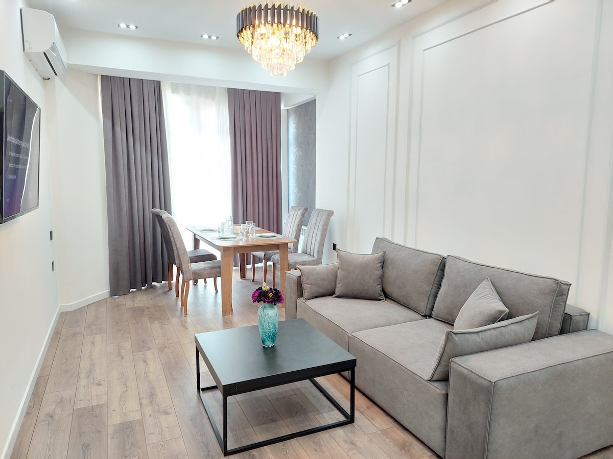 Ang bagong ayos na magandang studio apartment ay matatagpuan sa gitna ng lungsod at mayroon itong maigsing distansya sa mga pangunahing pasyalan tulad ng Targovy o Nizami Street (2 min), Seaside Boulevard (2 min), Old City at atbp. pati na rin ang napakadaling pag - access sa pampublikong transportasyon (2 min lakad papunta sa Sahil Metro s/t). Ang apt. ay perpekto para sa mga mag - asawa at may lahat ng lugar upang gawing ligtas at komportable ang iyong paglagi sa kusina, washing machine, bath essentials, AC, hygienic bed linen&towels, full - size bed, elevator