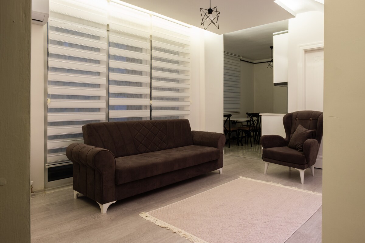 Maligayang pagdating sa iyong mapayapang bakasyon sa Ayvalık! Ang naka - istilong 2 - Br flat na ito ay perpekto para sa mga pamilya ng hanggang 4 na bisita. Nagtatampok ang maluwang na sala ng 2 sofa bed, kumpleto ang open - plan na kusina para sa lahat ng iyong pangangailangan. Kasama rito ang 1 silid - tulugan na may double bed at isa pa na may isang single bed. Masiyahan sa sariwang hangin sa iyong pribadong balkonahe, maging ligtas sa pamamagitan ng 24/7 na gated na seguridad ng komunidad. 1.5 km lang ang layo ng beach - sapat na malapit para sa mga pang - araw - araw na pagbisita, ngunit sapat na para masiyahan sa tahimik na gabi sa bahay.