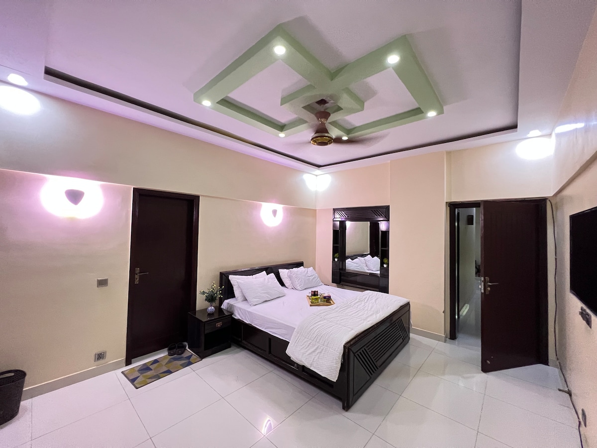 Nag - aalok ang aming apartment ng komportableng pamamalagi sa gitna ng Karachi. Isang magandang Dekorasyon na perpektong pinaghalo. Ang sala ay perpekto para sa pagrerelaks na may sofa at coffee table. Makikita mo ang lahat ng kailangan mo para magluto sa kusina, kabilang ang refrigerator, at mga pangunahing kubyertos. Ang silid-tulugan ay may queen-sized na higaan, 1 aircon, at TV para sa libangan. Masiyahan sa mga tanawin ng lungsod mula sa iyong pribadong balkonahe. Nilagyan ang banyo ng mga pangunahing gamit sa banyo. MAHIGPIT NA HINDI PINAPAHINTULUTAN ANG MGA HINDI KASAL NA MAG - ASAWA..