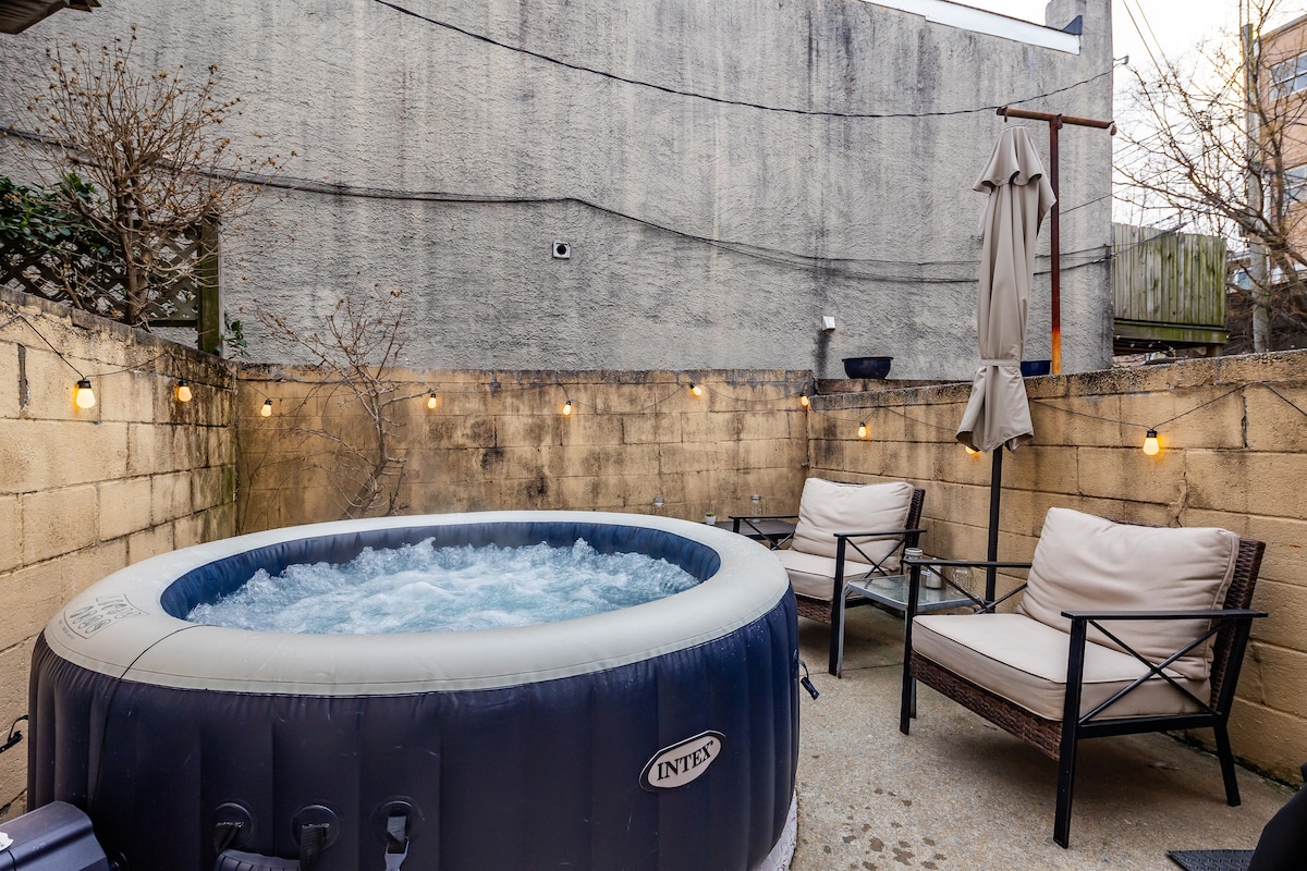 Bihirang hiyas na may roof top lounging area na may kamangha - manghang tanawin ng lungsod. Tiki bar sa patio sa ibaba, jacuzzi sa master bedroom. Ihatid sa lupain ng Aphrodite habang nagrerelaks ka sa maaliwalas na Greek themed master bedroom. Kung gusto mong mag-relax para sa isang mapayapang nakakarelaks na oras sa jacuzzi o magkaroon ng magagandang oras kasama ang mabubuting kaibigan, ang aming cool na kakaibang vibe ay babagay sa anumang nais mong gawin. Walking distance mula sa M & T stadium, Horseshoe Casino, Top Golf, at daungan.