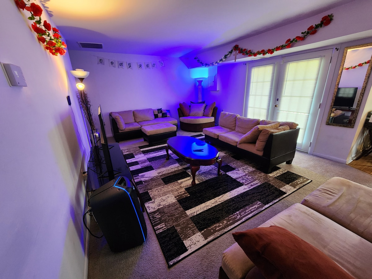 Isa itong maluwag na mas mababang antas ng bagong gawang tuluyan. May lounge, dinning, at kitchenette ang pribadong lugar ng bisita na ito bukod pa sa kuwarto at banyo. Ang mga bisita ay nagbabahagi lamang ng pangunahing pasukan ng townhouse sa mga may - ari na nakatira sa itaas. Kasama sa pribadong dekorasyong espasyo na ito ang smart TV, komportableng upuan, kainan para sa 4, microwave, coffee maker, buong refrigerator, toaster/air fryer, queen bed, aparador at aparador. Available ang washer/dryer kapag hiniling. Suriin ang mga alituntunin sa tuluyan bago mag - book