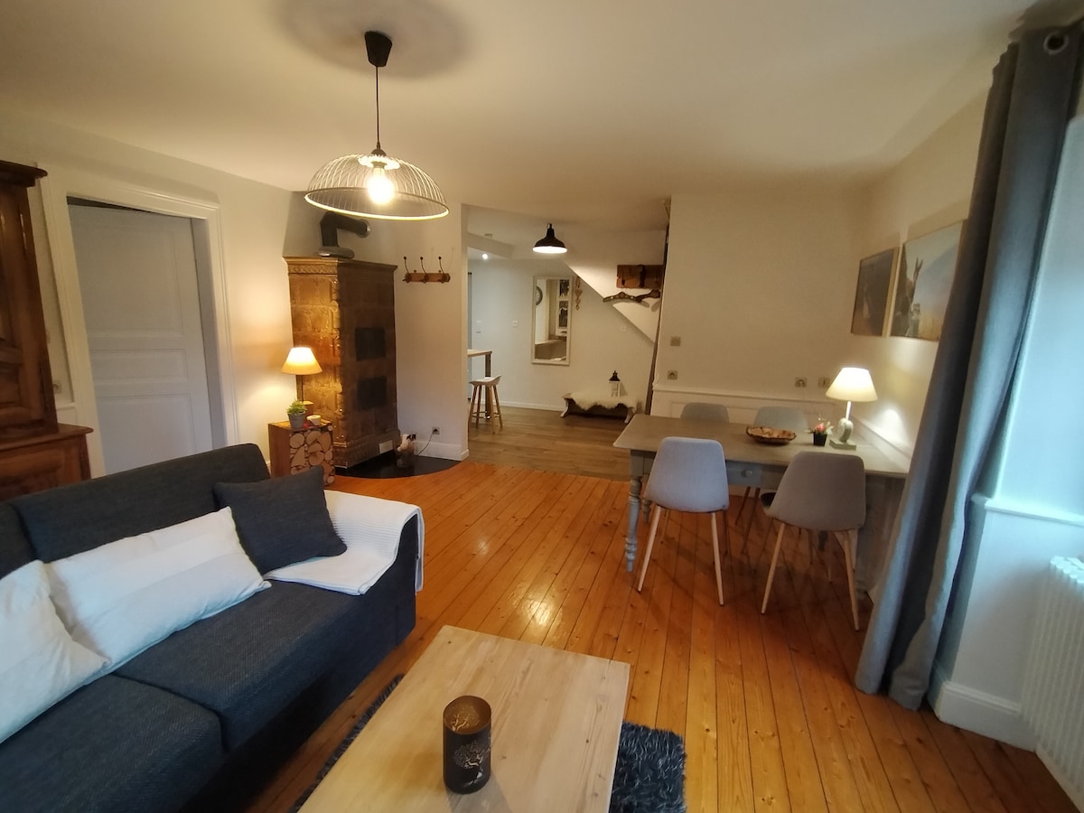 Tahimik na lugar, walang trapiko, na matatagpuan sa dulo ng dead end lane, malapit sa berdeng avenue, malaking palaruan (bocce court, basketball, slide, swing, bike trail) at mapayapang lawa. Sa ibaba ng 1 silid - tulugan na may 1 double bed, 1 silid - tulugan sa itaas na may 2 double bed at 1 desk/sala av 1 clic clac. Malapit sa mga tindahan (mga supermarket, panaderya, botika, restawran). Gérardmer sa 25min - mga ski resort sa 20min - Le Hohneck sa 25min - amusement park sa 30min - Colmar sa 45min