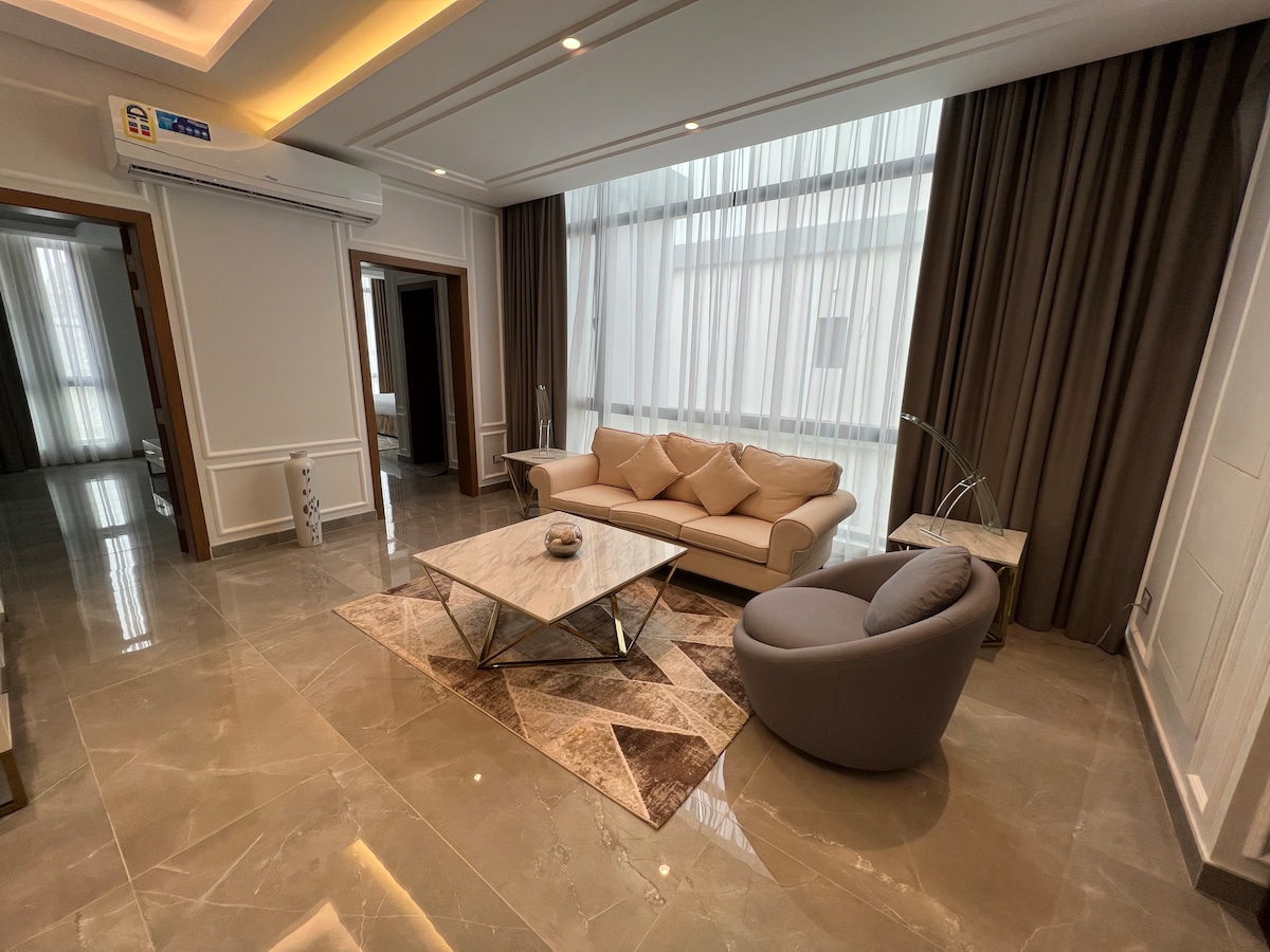 Isang marangyang apartment hotel na nasa gitna ng lungsod ng Khobar, sa isang maganda at tahimik na kapitbahayan, ilang minuto lang mula sa Corniche, Prince Turki Street, at Hess Square. Nasa magandang lokasyon ito na malapit sa mga pinakamahahalagang lugar at tahimik na matutuluyan. May mga modernong muwebles at marangyang jacuzzi ito, at may mga ilaw na nagpaparamdam ng pagiging komportable at elegante sa lugar. Tandaan: Mahigpit na ipinagbabawal ang mga party o pagtitipon para mapanatili ang privacy at kaginhawa ng mga residente. (Ire‑refund ang SAR 500 na insurance pagkatapos ng oras ng pag‑check out)