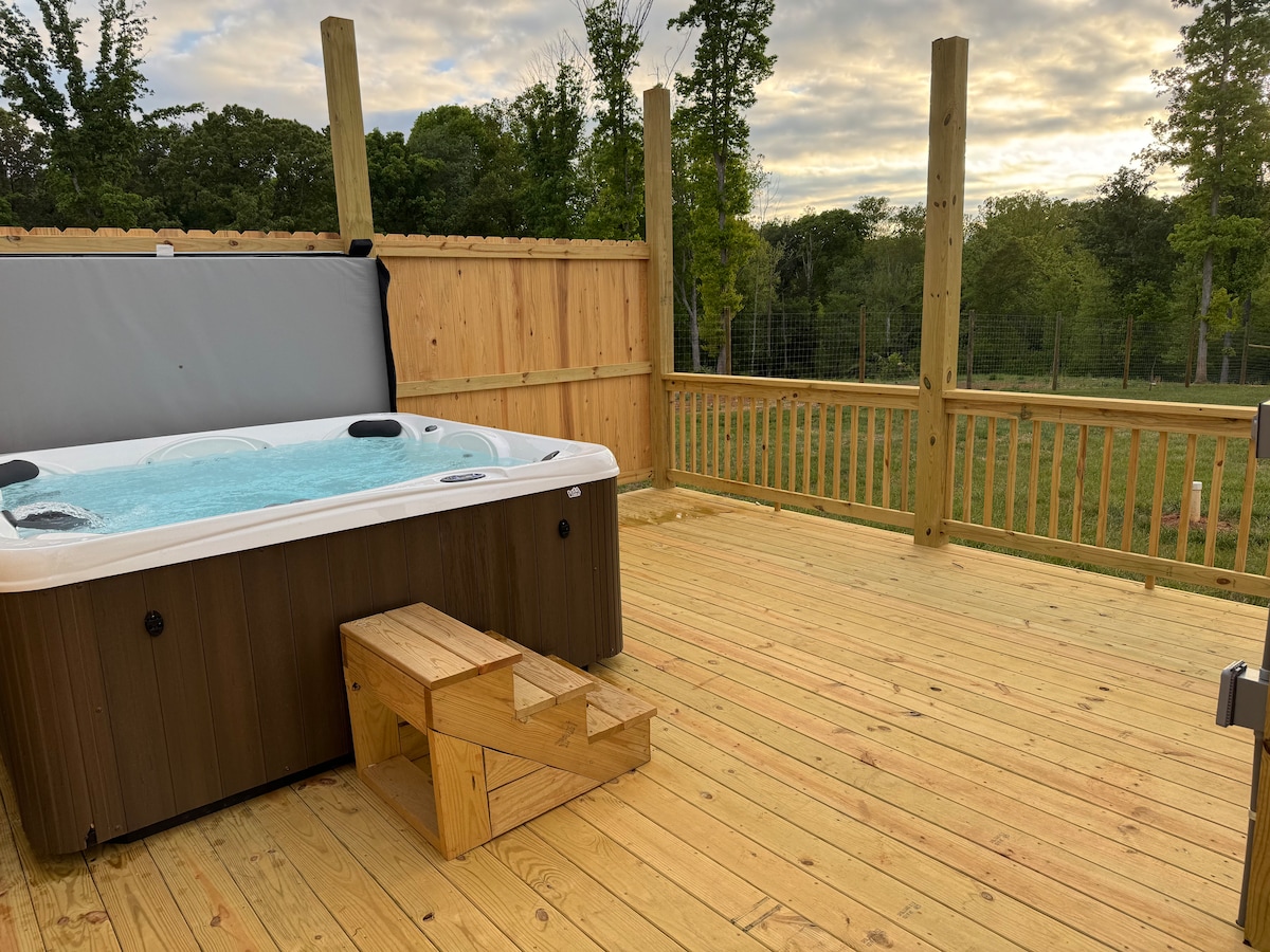 Gawa sa lumang kahoy at mga pinto mula sa bukirin ang cabin namin. Dahil madalas akong magkaroon ng sipon, naglagay ako ng heated floor at heated towel bar bukod pa sa mini‑split at de‑kuryenteng fireplace! Napapaligiran ang cabin ng mga pastulan kung saan nakatira ang mga baka, kabayo, kambing, pot belly pig, at manok namin. Ang pinakamagandang bahagi ng pamamalagi sa BWJ Cabin ay ang pag-upo sa rocking chair sa balkon, day bed swing, o hot tub habang pinagmamasdan ang tanawin at walang ginagawa.
