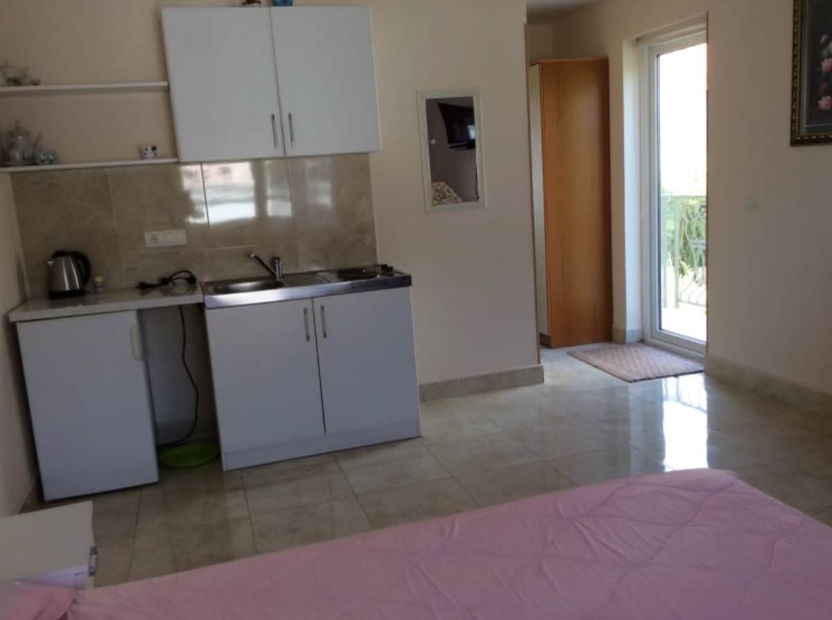 Cozy double-room apartments for 4 people. There are 1 double bed and 2 single beds inside. Apartment is equipped with own kitchen, bathroom, TV, air conditioner and free Wi-Fi. There are only 5-7 min. of walking to reach the beach. The nearest product shop and a restaurant with a local food - in 3 min. The apartment is surrounded by Adriatic garden with BBQ place.