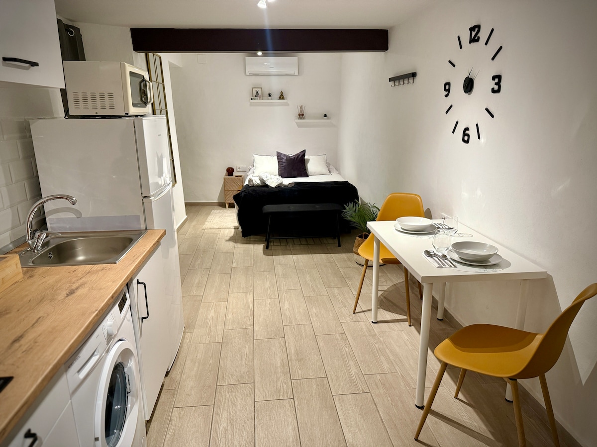 Disfruta de una experiencia única en este alojamiento en el centro de Jerez. Se trata de un estudio situado en la segunda planta de una casa antigua sin ascensor. Tiene ventanas al exterior, desde las que se ve la Catedral de Jerez, con paredes de piedra recuperadas de la construcción original del siglo XVIII y con una cuidada decoración. Dispone de un gran espacio en el que encontramos la cama, un lugar de estudio y una mesa de comedor, además, dispone de cocina completamente equipada.