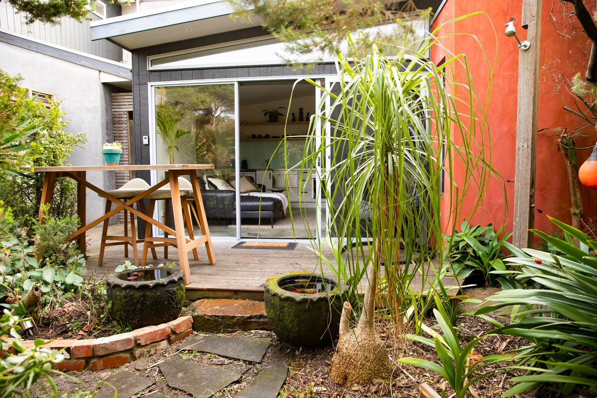Pribado at maaliwalas na guest suite na nakakabit sa pangunahing bahay sa tahimik na kalye, 4 na pinto mula sa beach na nakaharap sa hilaga at 2 minutong biyahe papunta sa sentro ng Cowes. Reverse cycle A/C at electric fire place sa lounge room na may award - winning na sofa bed, isang hiwalay na silid - tulugan na may king bed (electric blankets organic linen/cotton sheets) na kumpletong kagamitan sa kusina, banyo na may spa bath, shower, 6 na talampakang bakod na pribadong patyo, bbq, panlabas na setting at ligtas para sa mga alagang hayop. 30 minutong lakad sa beach papunta sa Main Street. Walang pinaghahatiang lugar.