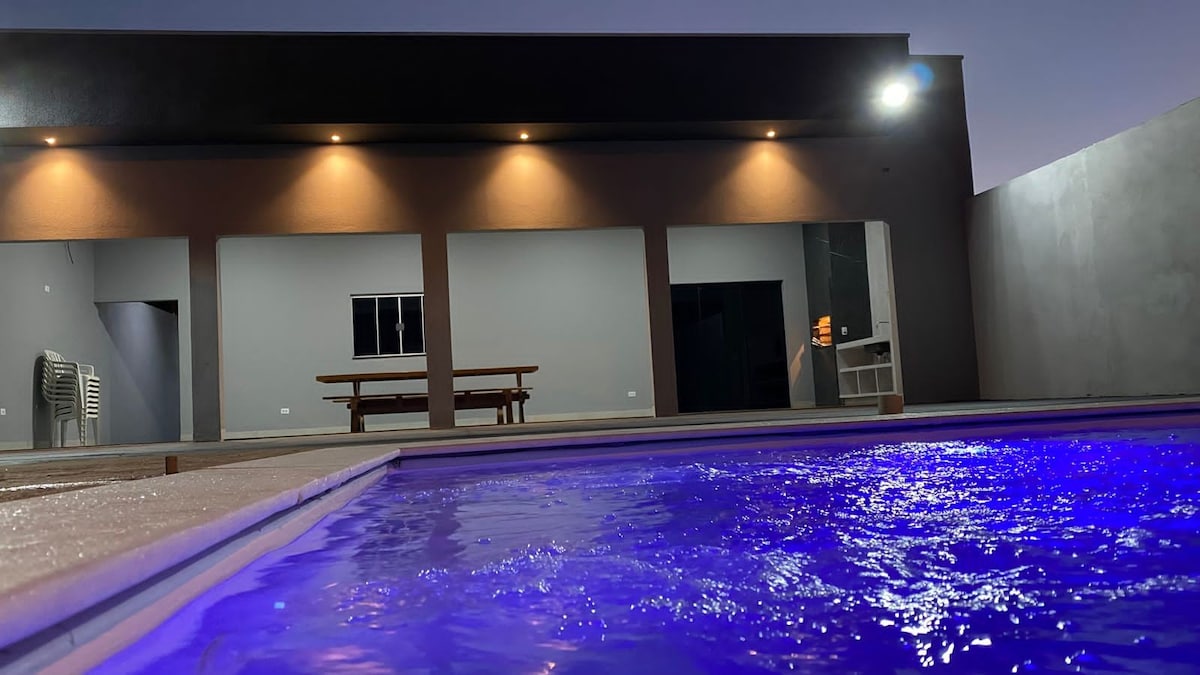 Nakaharap sa Ilog Paraná, sa Pres. Epitácio. Matatagpuan kami sa saradong residensyal na gate na may magandang beach sa harap ng bahay. Mayroon itong superior deck kung saan matatanaw ang ilog at sa paglubog ng araw ay pinili ang "The Most Beautiful in Brazil." Tatlong silid - tulugan ang dalawang suite (lahat ng naka - air condition) isang panlipunang banyo, isang pool area ng banyo. 6X3 Swimming Pool (opsyonal na heating mula Oktubre hanggang Marso) Sa tabi ng mahusay na mga opsyon sa pag - upa ng bangka sa pangingisda. 16 na minuto mula kay Pres. Epitácio . @ranchoalemdohorizonte