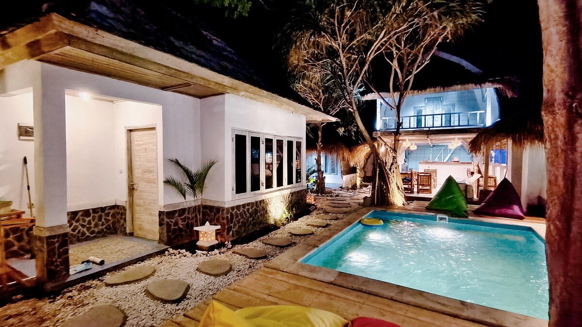 Shipwrecked paradise para sa mga bohemian wanderers at ang kanilang mga maliliit na bata. Matatagpuan sa hilagang bahagi ng sunset boulevard, makikita mo ang aming nakatagong santuwaryo. Kasama ang almusal, tsaa at kape araw - araw. Ang aming swimming pool ay isa sa pinakamalaking pool sa Gilis at ang kawayan na pelikula/laro ay perpekto para sa mga bata. Perpekto ang Deluxe room para sa mga biyaherong gusto at nangangailangan ng purong marangyang King bed na may kasamang opsyon.