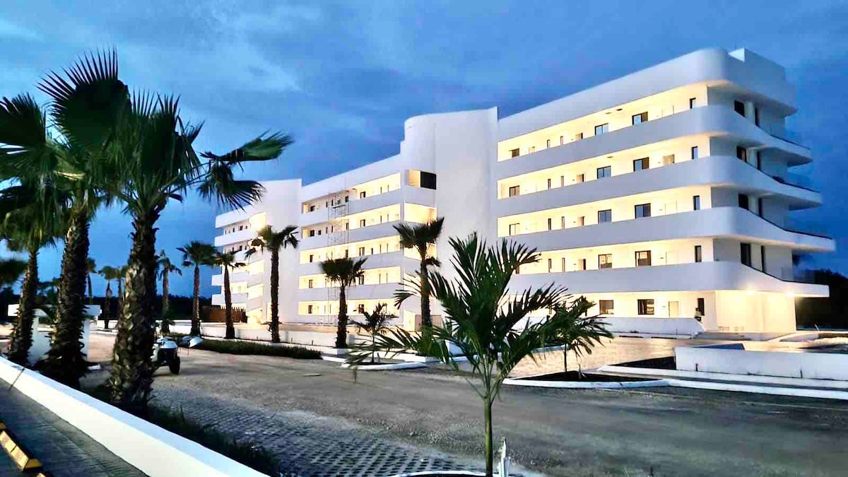 Kamangha - manghang apartment na may 2 maluluwag na kuwarto na may kani - kanilang banyo, at 1 banyo sa sala. Mga kinakailangang muwebles at kumpletong kusina, mayroon itong 2 balkonahe na may walang kapantay na tanawin ng pool area at sa kabilang dulo kung saan matatanaw ang nakakapreskong kalikasan na masisiyahan ka sa jaccuzzi ng iyong balkonahe (malamig na tubig lang). 7 minuto lang papunta sa beach sakay ng kotse at humigit - kumulang 20 minutong lakad. Libreng paglilipat! Huwag palampasin ang pagkakataon mong masiyahan sa magandang apartment na ito!