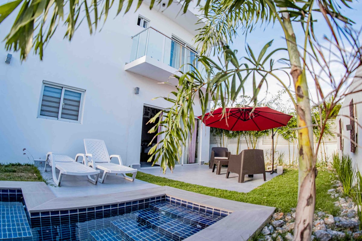 Matatagpuan ang aming maluwang at marangyang villa sa isang pribadong complex na may armadong seguridad na 5 minutong biyahe lang mula sa (coco bongo) sa downtown Punta Cana. Ang aming villa ay may pinakamagandang rooftop sa lugar na may pool table, heated jacuzzi, at BBQ area na perpekto para sa pamilya at mga kaibigan.