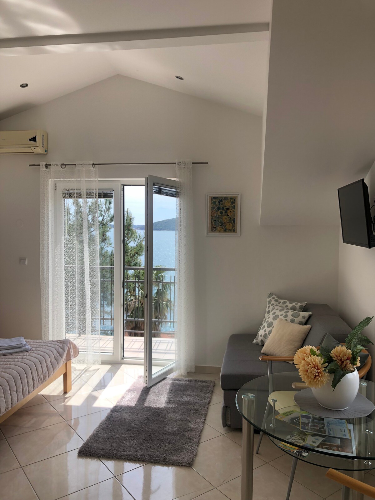 Nasa unang palapag ng bahay ang studio/apartment at may sarili itong kusina, banyo, at pribadong balkonahe. Makakapagmasid ka ng magagandang tanawin ng Boka Bay at Verige Strait mula sa balkonahe. Magagamit din ng mga bisita ang mga terrace sa harap ng bahay na nasa tatlong palapag. May mga mesa para sa kainan at pagkape sa mga terrace na ito, at may outdoor shower din—perpekto para magrelaks at magpalamig sa sariwang hangin ng dagat.