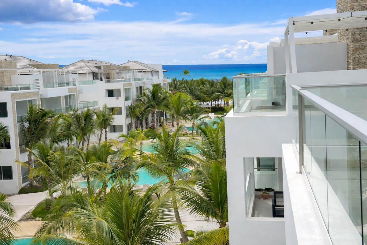 May sariling estilo ang pambihirang tuluyan na ito. Tatak ng bagong ikasiyam na penthouse na may kamangha - manghang tanawin ng pool sa loob ng bago at modernong tirahan na may 92 yunit at may komportableng posisyon. Common area pool at jacuzzi. Matatagpuan ang apartment mga 10 minuto mula sa beach, mula sa pedestrian street at sa tabi lang ng ikasiyam na komersyal na plaza na "Dominicus Village".