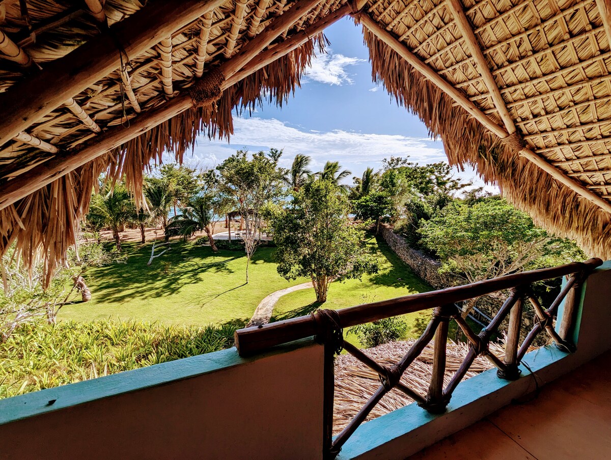 Enjoy tranquillity. Fall asleep to the sound of the ocean, as seen in front of your grand estate hut. Nestled in well-manicured gardens, the ocean and birds are all you hear as you enjoy communing with nature. Full meal catering may also be available on-site, or a fabulous restaurant is a just short walk away. Relax in the many hammocks, swim in the pool. Enjoy life... Naturally. Lounge area available above the main bedroom, with nature outlook and ocean views