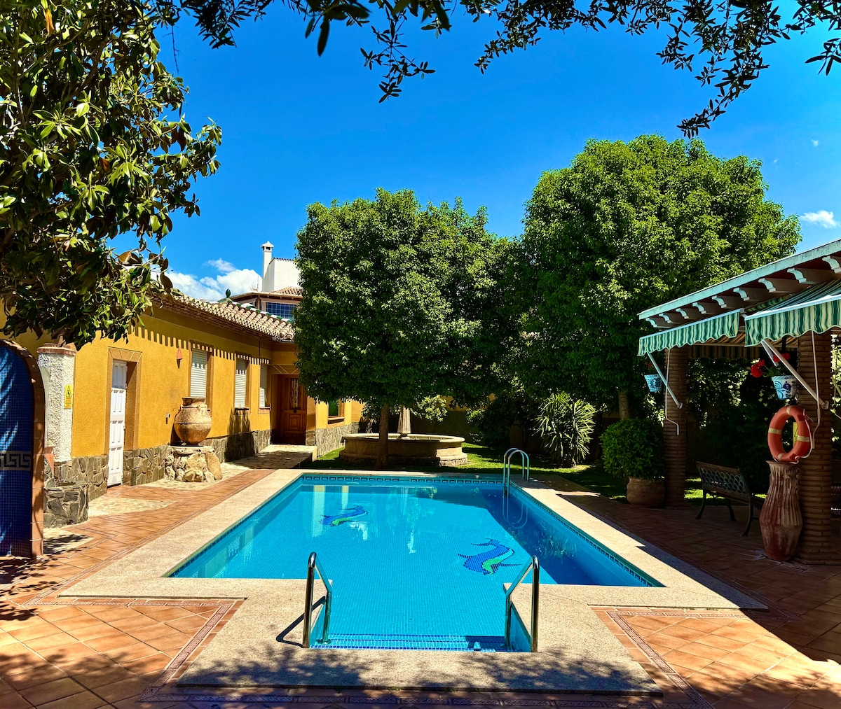 Nag - aalok ang villa na ito sa kanilang mga bisita ng posibilidad na magpahinga sa isang kamangha - manghang kapaligiran, na matatagpuan 10 minuto lamang sa Granada, at sa pasukan ng Sierra Nevada Natural Park. May bahay na kumpleto sa huling detalye, ang villa na ito ay may pribadong hardin na may pool na pinagana sa buong taon, pati na rin ang fireplace at libreng kahoy sa buong panahon ng iyong pamamalagi. Nº RTA: VTAR/GR/01115