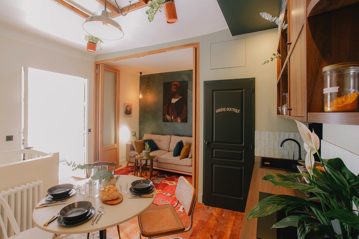 Ang "Comptoir de Roland" ay isang natatanging apartment sa gitna ng Les Halles. Si Roland ay isang dating merchant ng 50s at muli naming nilikha ang kanyang sikat na Counter! Ang dekorasyon ng Chin na inspirasyon ng mga epiko nito sa Greece at ng Orient, kumpletong kusina, sa labas ng 10 m2 na may upuan, 1 silid - tulugan, 2 shower room, wifi, tv... ang "Comptoir de Roland" ay ang PERPEKTONG lugar upang matuklasan ang Biarritz at mamuhay nang naaayon sa merkado ng Halles na nasa tapat lang.