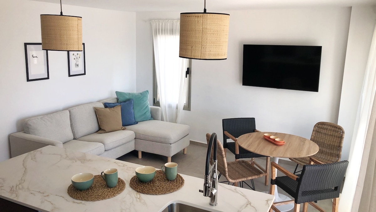 Dalawang minutong lakad ang layo mo mula sa Playa de las Vistas, mula sa balkonahe kung saan matatanaw ang dagat at ang beach . Mayroon itong 47m2 na mahusay na ipinamamahagi , Air conditioning, Smart TV 58", Internet fiber optic 100Mb, Desk computer. Kusinang kumpleto sa kagamitan: Refrigerator, Electric oven, Microwave, Washer, Dryer, Nespresso, Blender, Blender,atbp. Lahat ng kailangan mo para sa isang kahanga - hangang pamamalagi! Silid - tulugan na may air conditioning at banyong may rain shower. Napakatahimik sa lugar.