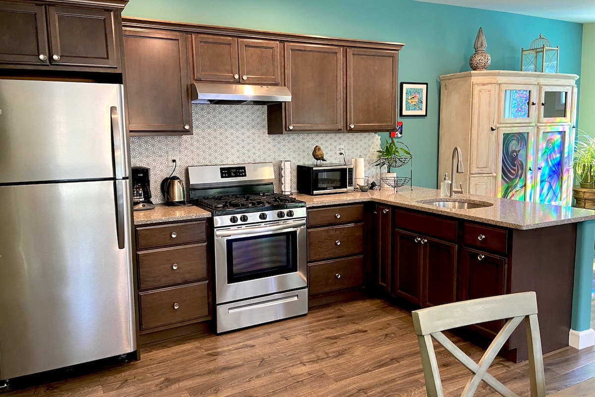 Perpekto anumang oras ng taon, matatagpuan ang two - bedroom one bathroom retreat sa paanan ng bulubundukin ng Sierra Nevada sa Grass Valley, CA. May maigsing distansya ang tuluyan papunta sa Nevada County Fairgrounds at 20 minutong biyahe papunta sa Yuba River. Kung naghahanap ka ng malinis, kalmado at nakakaangat na lugar, ito ang tuluyan para sa iyo! Matatagpuan sa 3 ektarya ng makukulay na halaman at puno at pinalamutian ng modernong artistikong flare.