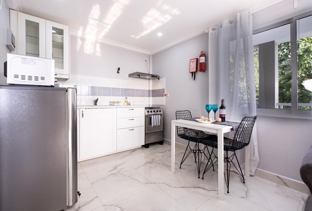 Lahat ng open-space self catering apartment sa paligid ng 53 sq.Mayroon ka ng lahat ng pangunahing bagay para maging komportable at gawing espesyal ang iyong pamamalagi. Magrelaks sa mga nakakamanghang tanawin na nagbabago sa bawat minuto, araw - araw. Kahit na sa mga tag - ulan ay nakakatuwa na nakatingin lang sa dagat at parang nasa bangka habang nakikita mo ang mga patak na lumilikha ng kanilang mga disenyo sa patag na dagat. Sa mahangin na mga araw, panoorin ang paghampas ng mga alon sa harap mismo ng iyong terrace.Tangkilikin ang buhay sa isla na may kaginhawaan ng isang bagong gusali na napapalibutan ng kalikasan