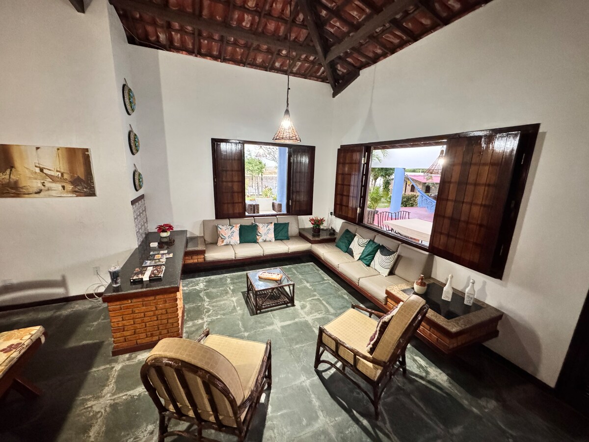 Malawak at maaliwalas na bahay. Matatagpuan sa paradisiacal na Morro Branco beach. Malapit ito sa dagat, mga talampas at magagandang dune. Ang aming bahay ay naglalaman ng 4 na komportable at komportableng suite, banyo, sala, silid - kainan, pribadong sala, malaki at may gamit na kusina. Sobrang gandang balkonahe sa paligid ng bahay, may sapat na espasyo para sa paradahan. Rain shower, deck na may barbecue, kalang de - kahoy at palikuran. Ang kahanga - hangang pool na may makintab na bato at naiilawan sa gabi.