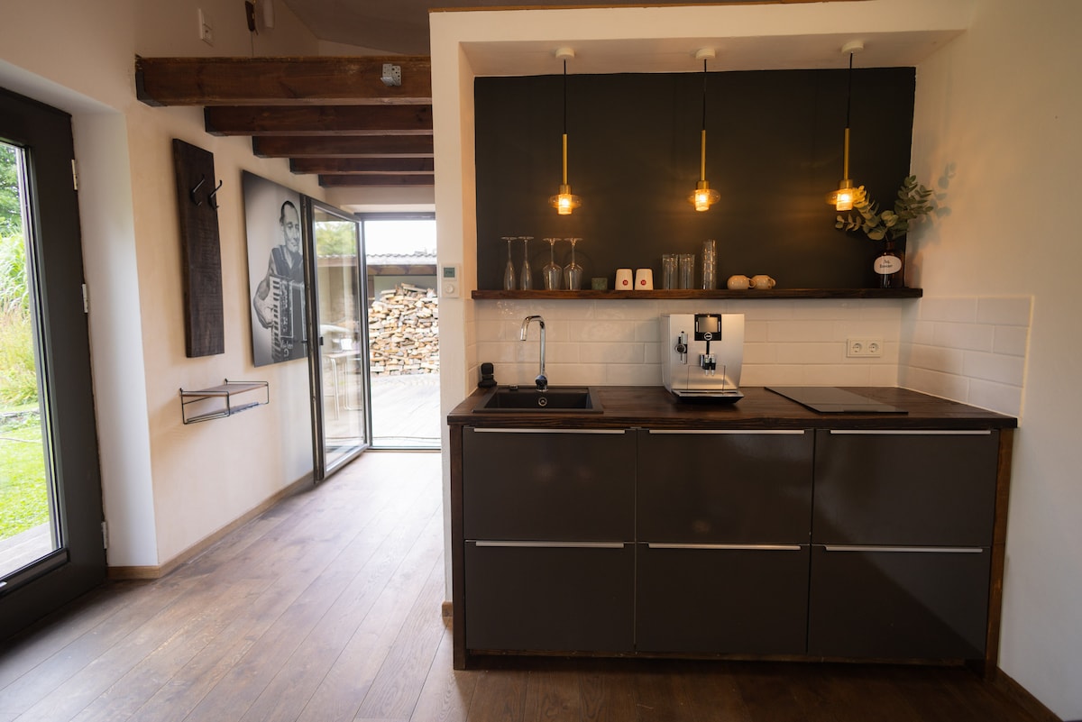 Entfliehe dem hektischen Arbeitsalltag in unserem stilvollen Designer Tiny House! Hier findest du den perfekten Rückzugsort, um nach einem Arbeitstag zu entspannen. Genieße die Ruhe am Natur-Schwimmteich und entspanne auf deiner privaten Terrasse. Modern und komfortabel eingerichtet, bietet das Haus alles, was du für eine erholsame Auszeit benötigst. Die naturnahe Umgebung hilft dir, den Kopf frei zu bekommen und neue Energie zu tanken. Erlebe, wie entspannend z.B. eine Geschäftsreise sein kann!