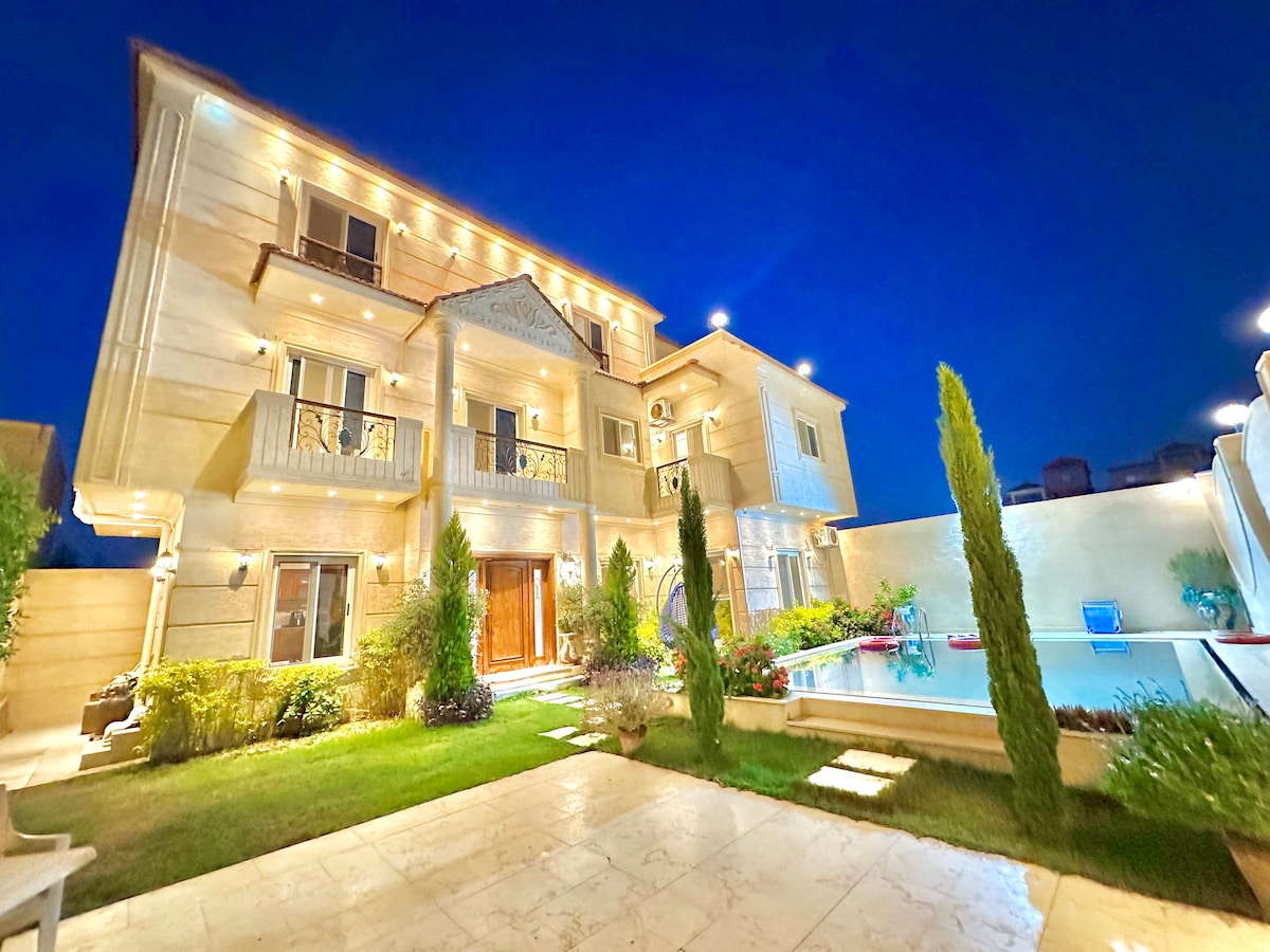 Modern & Stylish spacious villa + nice Sunny Garden house in Golf Al Solaimaniyah 15 minutes far from Sphinx international airport. The Villa is surrounded by over 800 m2 private garden, 10*5 pool and woodland, guaranteeing privacy and peace. Stroll the formal gardens, relax by the pool or spend the day at the great new Grand Egyptian Museum and Giza Pyramids are just 25 minutes away. The villa is well-connected, with satellite TV/ SMART TV, and Wi-Fi access.