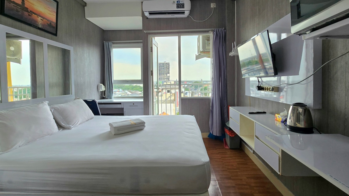 Manatiling komportable sa isang mainit na studio room na may magandang tanawin ng lungsod at ang lagoon sa tabi. Nakumpleto sa set ng kusina, queen bed size at working space na may walang limitasyong wifi access, ang iyong pamamalagi ay parang bahay. Tangkilikin ang iba 't ibang mga pasilidad: swimming pool, lugar ng paglalaro ng mga bata, gym, shopping mall, sinehan at iba' t ibang mga restawran. Para sa kadahilanang pangkalusugan at pangkaligtasan sa lahat ng bisita, nililinis ang apartement na ito gamit ang antiseptiko at desinfectant bago ang pag - check in.