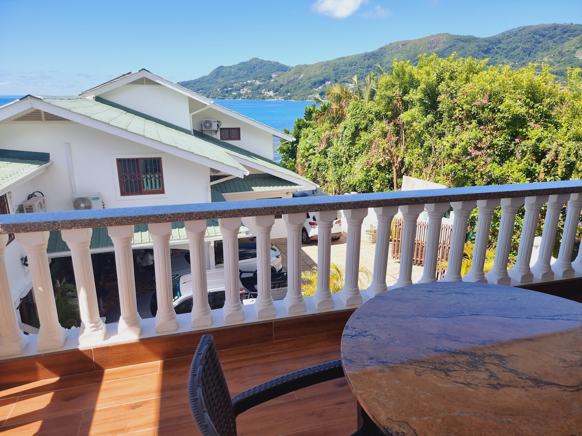 May magandang tanawin ng dagat ang studio apartment kung saan makikita ang isla ng Silhouette at North Island sa abot‑tanaw mula sa balkonahe. Ang pagiging intimate nito ay angkop para sa mga mag‑asawa at mga business traveler. Matatagpuan ito sa unang palapag na maa-access sa pamamagitan ng isa at kalahating hagdan. Ang mga katutubong ibon na kumakain ng mga prutas na abot-kamay ay nagpahusay sa karanasan!