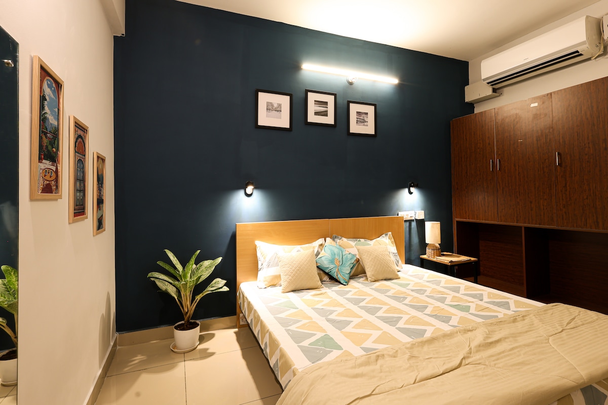 Nagtatampok ng brutalist architecture at modernism ang magandang apartment na ito na may 3 kuwarto at kusina at matatagpuan ilang metro lang ang layo sa sikat na Sony World Signal sa Koramangala. Idinisenyo ito nang may masusing atensyon sa detalye para mapanatili ang balanse sa pagitan ng estilo at kaginhawaan. Mayroon itong lahat ng kinakailangang amenidad tulad ng kumpletong kusina, mga AC, wifi, bar counter, power backup, wet at dry bathroom, elevator, 2 balkonahe, at may takip na paradahan ng kotse. Mas nagiging buhay‑buhay ang lugar dahil sa malalaking halaman.