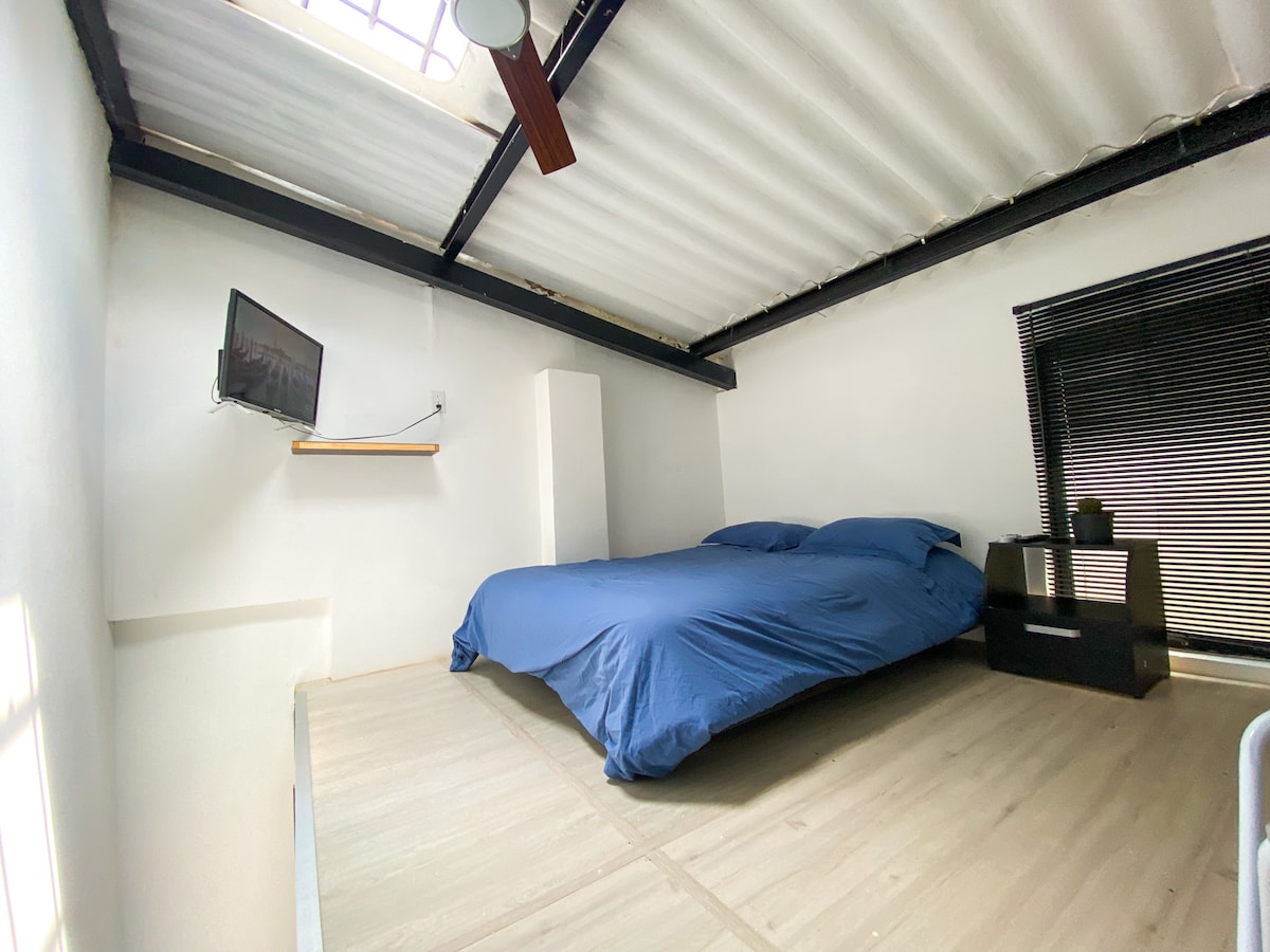 Tuklasin ang loft na parang studio sa loob ng naayos na kolonyal na bahay, apat na bloke lang mula sa tradisyonal na kapitbahayan ng San Antonio. Perpekto para sa mga solong biyahero o magkasintahan, nag‑aalok ito ng air conditioning, mabilis na WiFi, kusinang kumpleto sa gamit, at access sa nakabahaging rooftop terrace na may mga tanawin ng lungsod. Isang perpektong lokasyon na malapit sa mga café, restawran, at pangunahing atraksyong panturista ng Cali.