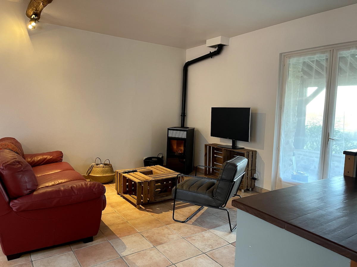 Loft ng 50m², kamakailan - lamang na renovated, napaka - maginhawang at maliwanag, sa ika -2 palapag ng isang lumang bahay, ng karakter, na matatagpuan sa gitna ng isang classified village, sa isang tipikal at tahimik na kalye. Nilagyan ng kusina, seating area na may flat screen, banyong may bathtub ng isla, air conditioning...