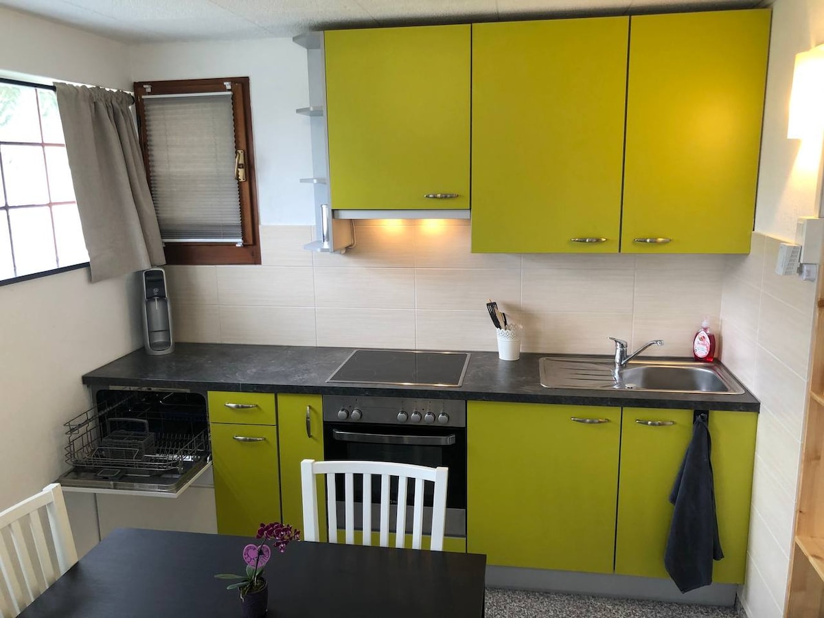 Matatagpuan sa tahimik na nayon sa kabundukan. Napakalinaw, maliit ngunit komportableng studio apartment para sa isa o dalawang tao, pribadong pasukan. Sofa bed na 140cm kada 200cm. Nilagyan ng dishwasher at lahat ng kailangan mo para sa pagluluto. Aparador, dibdib ng mga drawer at iba 't ibang espasyo ng imbakan. Malaking shower na may toilet. Lugar sa labas na may mesa at mga upuan sa ilalim ng maringal na puno ng cherry. Mayroon ka ring magandang 8m by 4m swimming pool na may maximum na lalim na 1.90m.