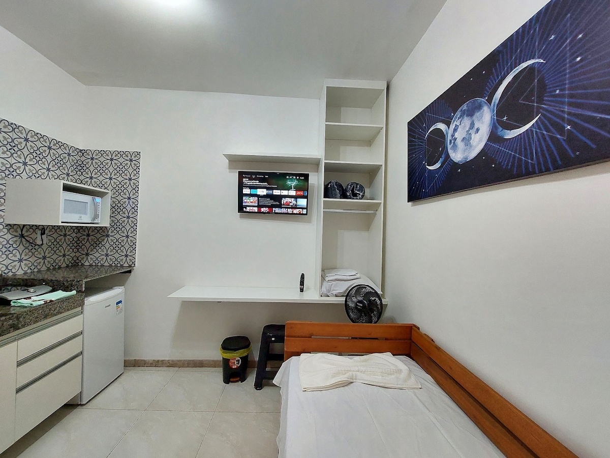 Magrelaks sa komportable at functional na lugar na ito, na perpekto para sa mga naghahanap ng kaginhawaan na may estilo. Nag - aalok ang aming compact kitnet ng dalawang single bed sa estilo ng bicama, na tinitiyak ang magandang pahinga sa gabi. Ang kapaligiran ay may Air Conditioning, na nagbibigay ng higit na kaginhawaan. Nilagyan ang kusina ng mga pangunahing kailangan para ihanda ang iyong almusal at mabilisang pagkain tulad ng minibar, microwave at cooktop. Maluwag at moderno ang banyo, na may sistema ng pagpainit ng tubig para sa iyong kapakanan.