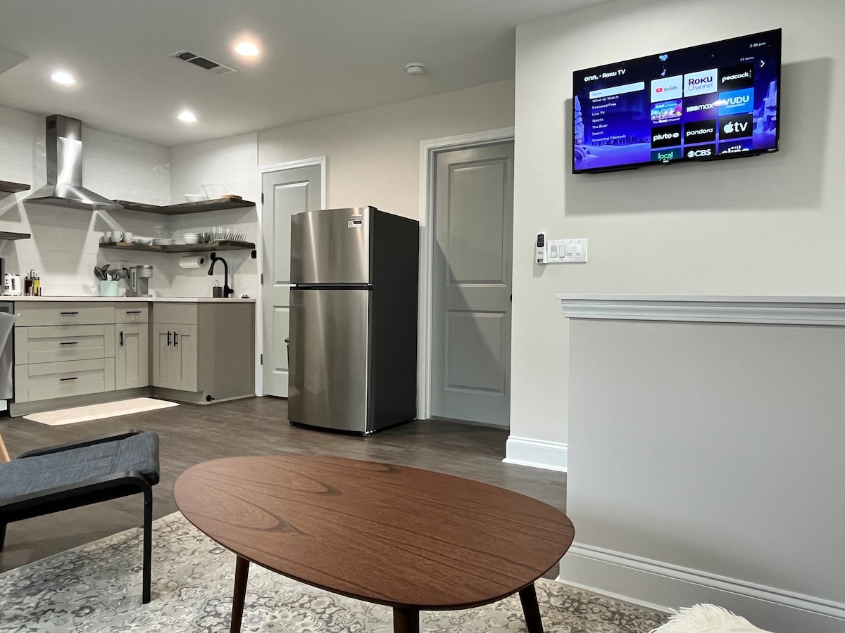 Tangkilikin ang aming maginhawang carriage house apartment na matatagpuan sa mga puno at puno ng napakarilag na natural na liwanag. Ang 2nd story apartment na ito ay itinayo noong 2021 na may madilim na sahig ng oak, maliwanag na quartz countertop, at pinaghalong moderno at vintage na muwebles. Ang sining sa buong apartment ay nilikha sa pamamagitan ng mga illustrators ng larawan ng libro. Bago ang lahat ng kasangkapan, kabilang ang dishwasher at combo washer/dryer unit. Available ang masaganang paradahan sa kalye at matatagpuan ang tuluyang ito kalahating milya lang ang layo mula sa downtown Decatur.