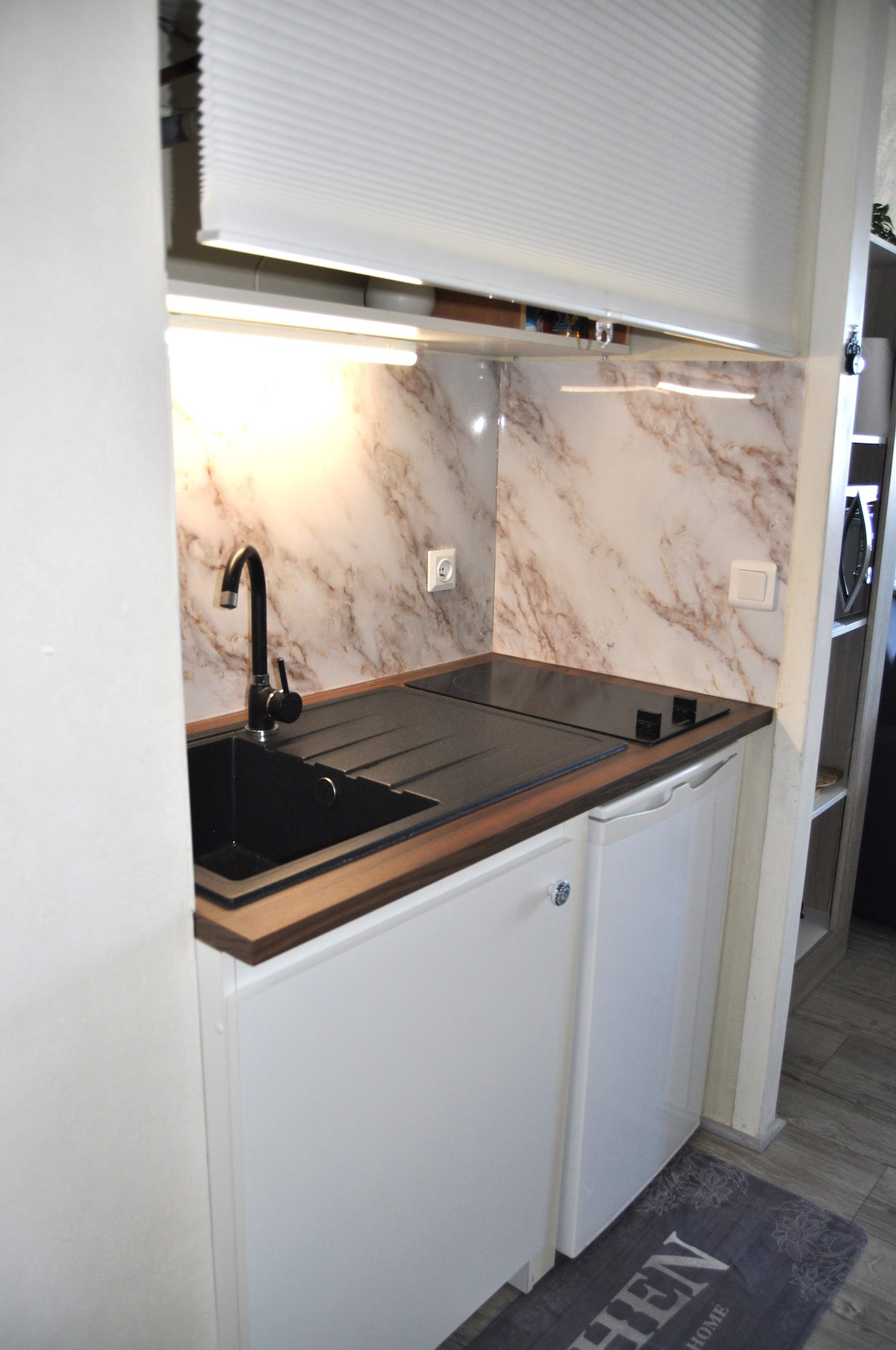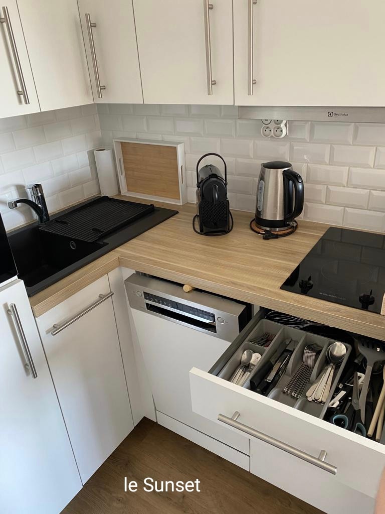 Tangkilikin ang aming studio na may balkonaheng nakaharap sa timog at Balneo bathtub sa Marina. Mayroon itong totoong 160x200 na higaan na may mga linen sheet, Wifi, nakakonektang TV, kusinang may kasangkapang dishwasher, organic bean coffee machine na may grinder, organic na tsaa at sodastream, 1 bote ng sariwang lokal na cider na iniaalok, Wifi. Makakapagrelaks sa banyong may bathtub para sa isang tao. Hiwalay ang palikuran. May libreng paradahan sa ibaba ng gusali.