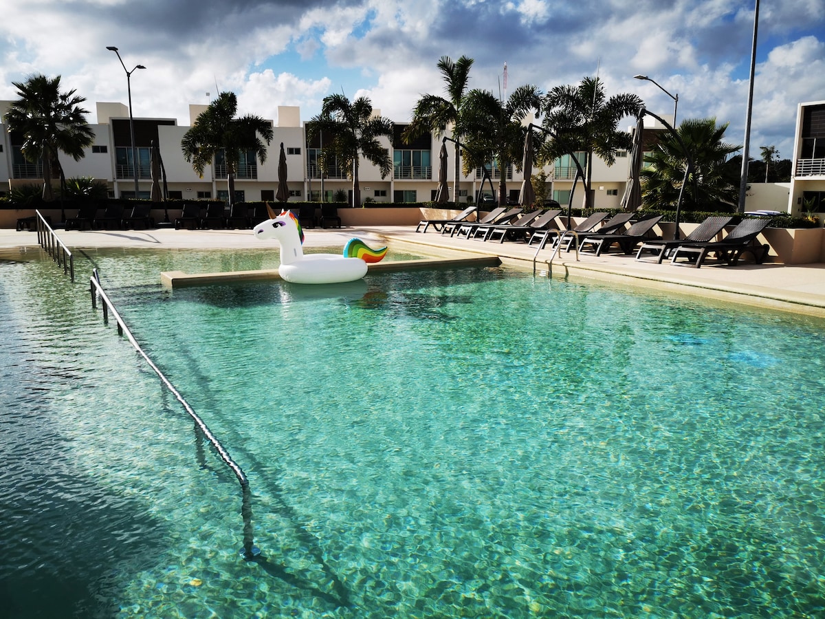 Enjoy a stylish stay in this central and convenient apartment. Just 5 minutes from shopping centers and supermarkets. We are close to the road that leads to Tulum, Playa del Carmen, and the Cenotes Route. The condo has a pool and 24/7 security. Only 15 minutes from the airport and 7 minutes from the Hotel Zone. ** Children under 6 years old are not allowed.