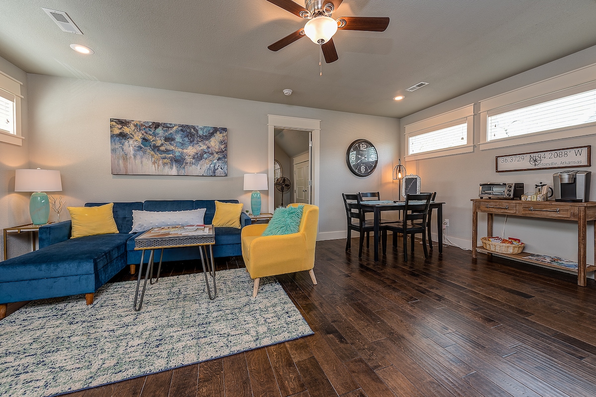 Mga hakbang sa mga trail ng bisikleta, Momentary Museum, mga restawran, ang ika -8 na pamilihan sa kalye, downtownage} onville at minuto sa Crystal Bridges Museum. Bagong bahay - tuluyan sa likod ng bagong inayos na Victorian na tuluyan noong 1920 na itinampok sa Fixer hanggang sa Fabulous sa % {boldTV. Malaking queen bedroom at queen - sized Murphy bed sa living room area. Washer/dryer at kumpletong pagkain sa kusina, Bike wash at pribadong deck, pati na rin ang paradahan ng bisita na magagamit sa lugar. Perpekto para sa mga mahilig sa bisikleta at sining!