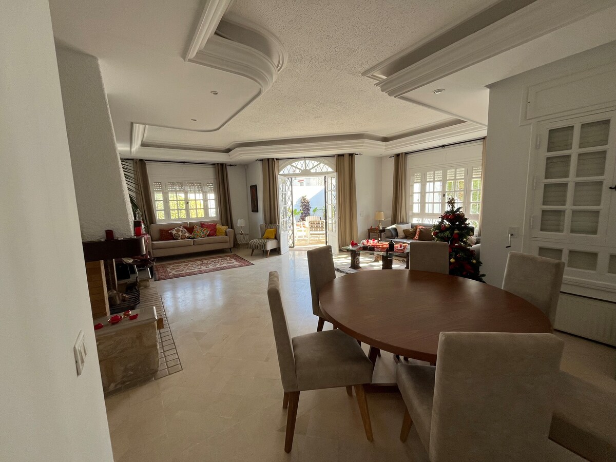 Magandang villa na may istilong arabesque na may lawak na900m². Itinayo sa 5000m² lot sa pasukan ng Marsa, 10 minuto ang layo mo mula sa mga pangunahing sentro ng turista sa rehiyon tulad ng mga beach ng Marsa, mga archaeological site ng Carthage, kaakit - akit na nayon ng Sidi Bou Said at mga naka - istilong restawran at bar ng Gammarth. Sa pamamagitan ng 5 silid - tulugan, 4 na banyo, 3 sala, hardin at pool, magkakaroon ka ng lahat ng modernong amenidad na kailangan para masulit ang iyong pamamalagi.