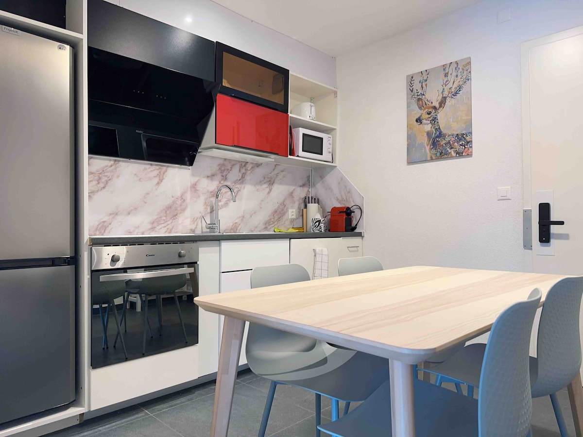 NAKAMAMANGHANG TANAWIN NG BUNDOK 🍀 PRIBADO: - 2 silid - tulugan na may NAKAMAMANGHANG TANAWIN NG BUNDOK, ang bawat isa ay may 180 cm BoxSpring King - Size bed - 160 cm sofa bed sa sala na may NAKAMAMANGHANG TANAWIN NG BUNDOK - Kumpletong kagamitan sa kusina, fondue🫕, pampalasa🌯, dishwasher, oven, microwave, atbp. - Maluwang at modernong banyo na may 3 mode ng shower - 65" TV, High - Speedinternet 🛜 IBINAHAGI : - Magandang shaded terrace, palaruan - Infrared Sauna - Mga libro at board game 📚🧩 Mainam para sa MGA PAMILYA at KAIBIGAN ! 🌷👙🫧🩳🩱🚠🧗♀️🌞🍄⛷️☃️