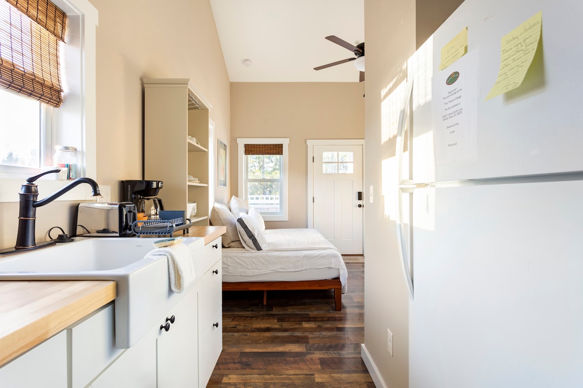 Welcome to the "Tiny Thyme Cottage" at Good Earth. The cottage is super cozy, perfect for a couple, with 1 queen bed, a kitchen & bathroom, and a small living area. You'll be staying on our 10-acre property, 4.7 miles from Bethany Beach. Convenient amenities include 2 on-site restaurants, market, theater, and ample parking. Our AIRBNB "Village" includes 2 tiny houses, a lofted apartment, and 2 cottages on the property. Staying at Good Earth is more than just a beach trip!