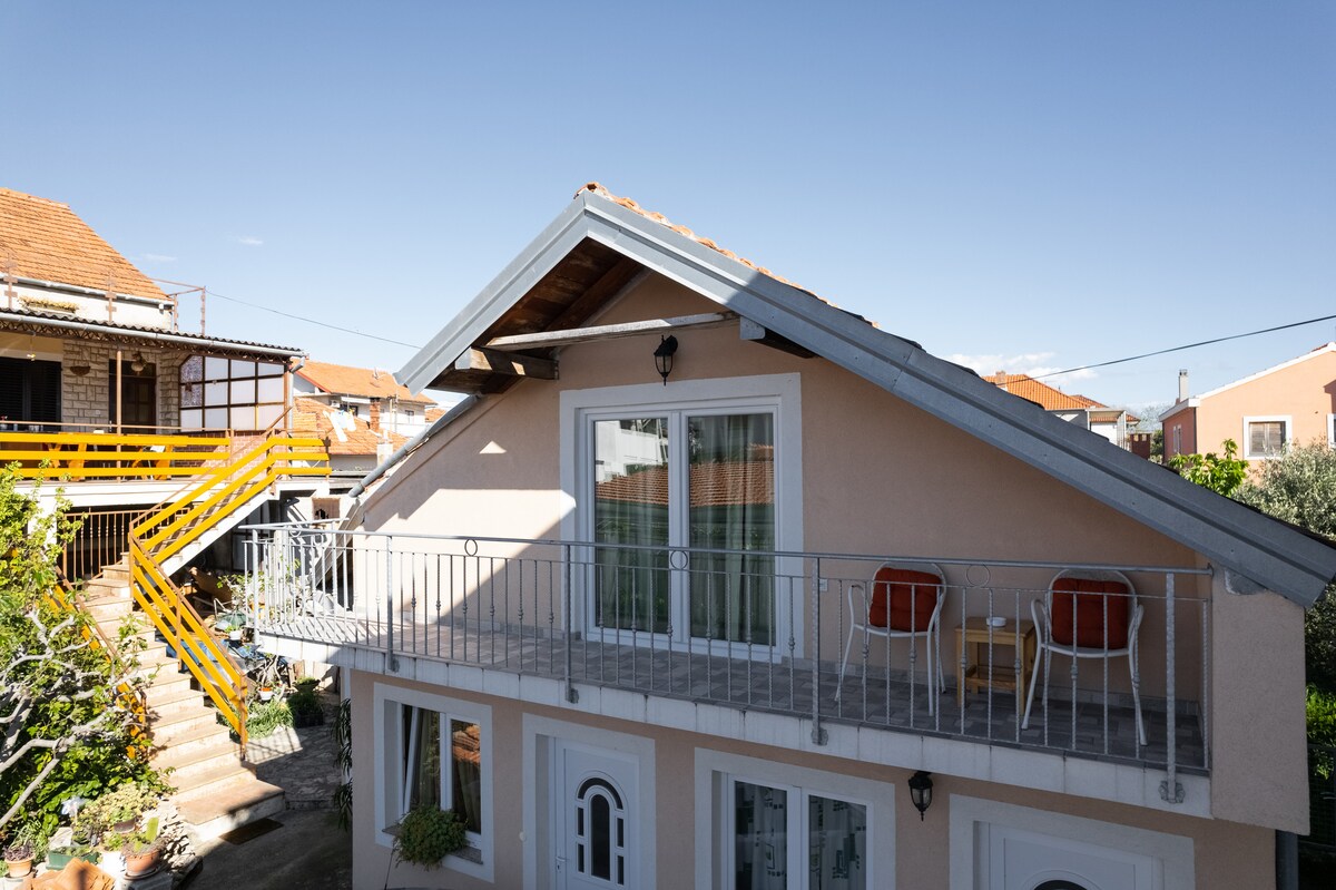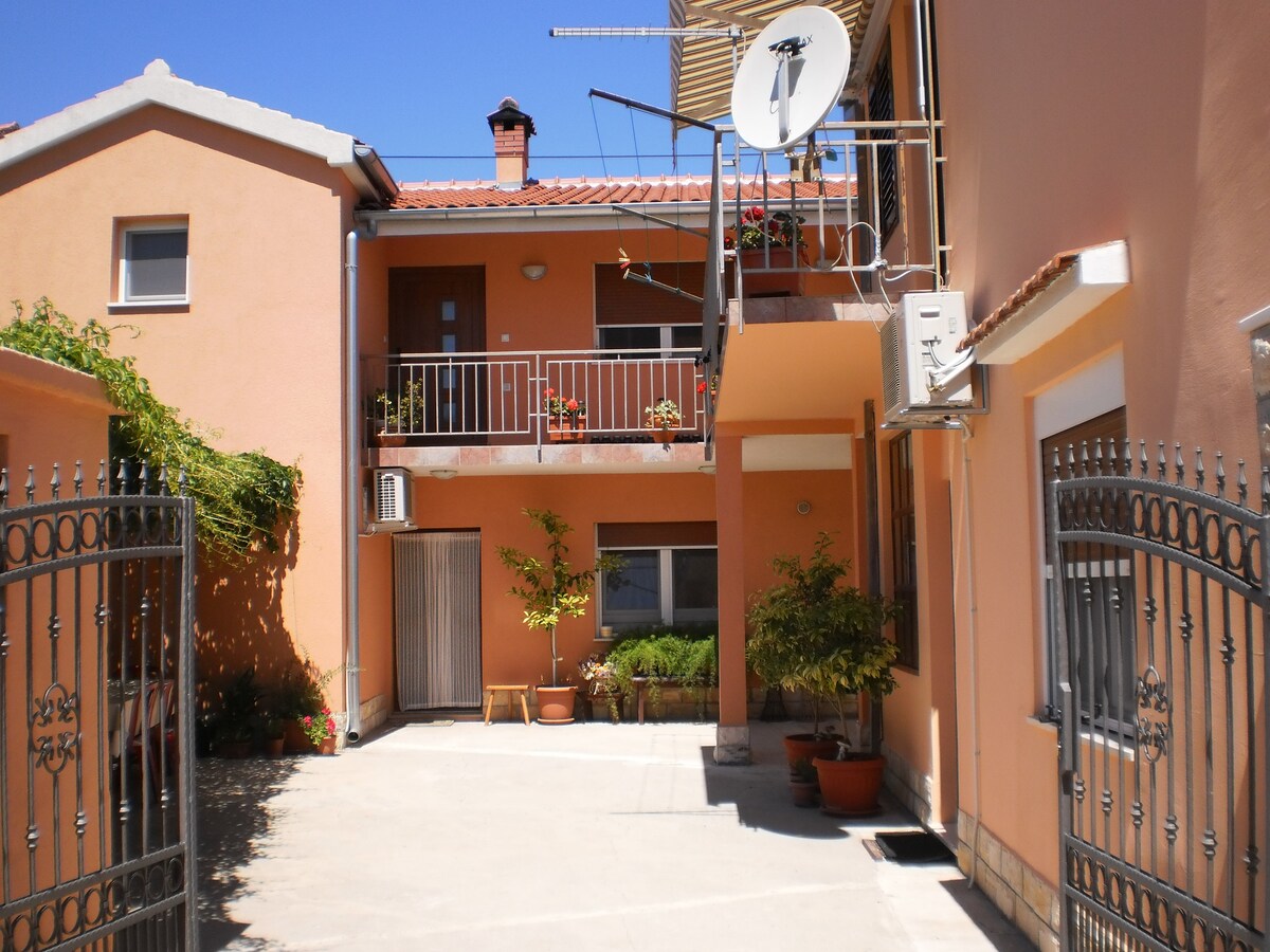 Our apartment is alone house in small calm street 25 to 30 minutes of walking to the old town and to the closest beach. We are offering you small apartment with one sleeping room with bathroom upstairs, and also dining room downstairs. Has a parking spot. Pets are welcome. Calm location near ŠC Višnjik away from city center.