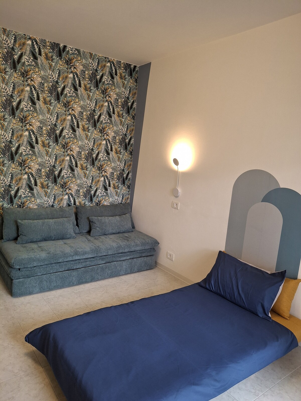 Naka - air condition na apartment 2nd floor, elevator, 150 m beach at 500 m shopping avenue, tahimik na lugar, mahusay na pinaglilingkuran ng iba 't ibang mga komersyal na aktibidad sa loob ng 50 m. Terraced living room na may LED TV/Chromecast at 2 single side - by - side sofaniletto, equipped kitchenette, microwave+grill, dishwasher, washing machine, DolceGusto coffee machine at kettle. Double room na may malaking terrace. Sa sala 2 sofa bed. Banyo na may shower, hair dryer. Condominium parking lot hanggang sa maubos ang mga upuan.