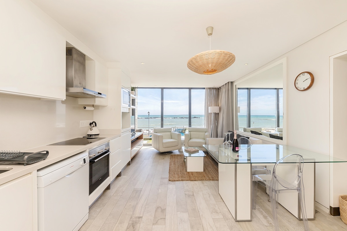 Lumanghap ng sariwang hangin sa karagatan mula sa chic na bakasyunang ito. Nagtatampok ang tirahan ng open concept main space, monochromatic interior, isang stripped - down na design aesthetic, at sliding glass door na papunta sa terrace. Tangkilikin ang magagandang tanawin ng karagatan at Table Mountain. Smart tv kung saan maaari kang mag - log in sa iyong Netflix account. WiFi 2 parking bays at imbakan. Isinara ang fireplace ng pagkasunog na may malalawak na bintana at mabilis na pinapainit ng thermo fan ang buong apartment sa isang maaliwalas na tuluyan. Mayroon kaming nutribullet para sa iyong malusog na smoothies sa umaga sa terrace. Walking distance sa beach Malaking pribadong balkonahe na may mga bbq facility. Mayroon kaming dalawang underground parking bays pati na rin ang garahe para sa mga kite boarder upang iimbak ang kanilang mga kagamitan. Buksan ang plano ng kusina at living area. Paghiwalayin ang banyo at silid - tulugan. Ang sala at silid - tulugan ay parehong nakabukas papunta sa maluwag na balkonahe. Ang apartment ay matatagpuan sa loob ng malalakad mula sa beach, at malapit sa pinakamasasarap na restawran, cafe, at tindahan sa Cape Town.