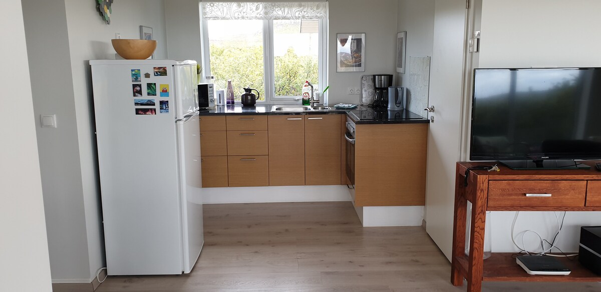 Magandang 37m2 na cottage na nasa gitna ng Stykkishólmur, na may tanawin ng Breiðafjörður mula sa sala. Perpektong lokasyon at maikling lakad lang papunta sa daungan, mga restawran, grocery store, at community pool. Maliit pero maluwag ang cottage na ito na bagong ayusin at may sahig na gawa sa kahoy at geothermal underfloor radiant heat. Banyong may shower at pribadong kuwarto para sa dalawang tao. Makakapamalagi ang 1–2 karagdagang bisita sa loft sa itaas.